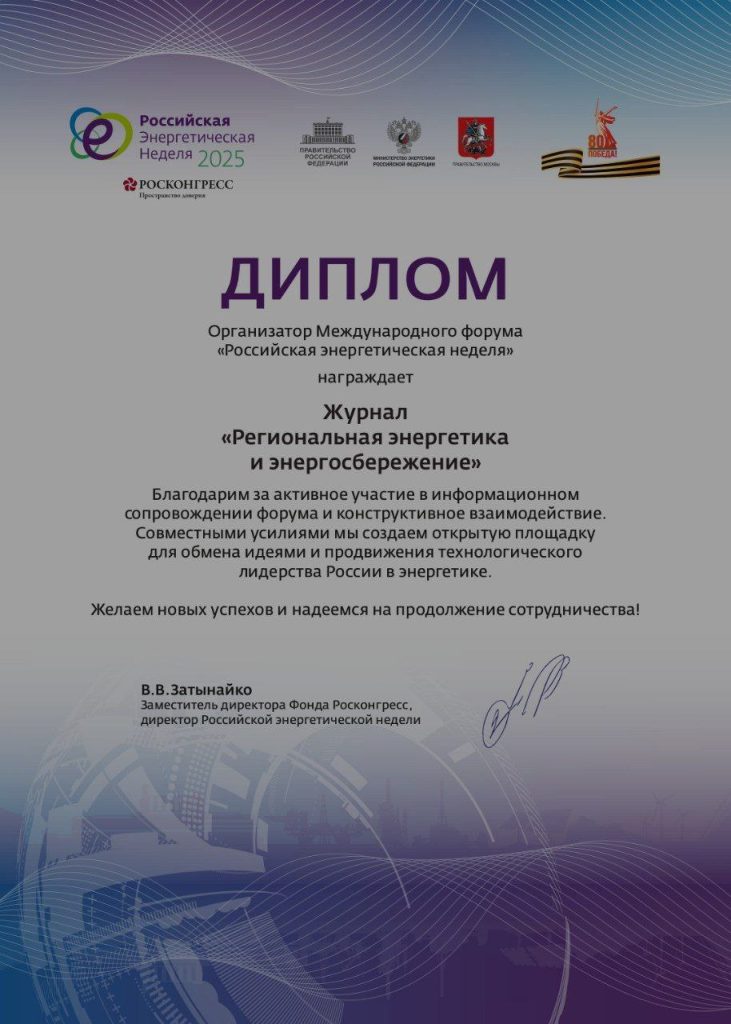 Редакции информационно-аналитического журнала «Региональная энергетика и энергосбережение» объявлена официальная благодарность Фонда «Росконгресс» за активное участие в информационном сопровождении Международного форума «Российская энергетическая неделя», проходившего в Москве 15 – 17 октября 2025 года, и за конструктивное взаимодействие. Деятельность редакции отмечена ДИПЛОМОМ за подписью заместителя директора Фонда «Росконгресс», директора «Российской энергетической недели» В. В. Затынайко. «Совместными усилиями мы создаём открытую площадку для обмена идеями и продвижения технологического лидерства России в энергетике. Желаем новых успехов и надеемся на продолжение сотрудничества!» – отмечается в ДИПЛОМЕ.Фонд «Росконгресс» – организатор таких масштабных международных мероприятий, как Санкт-Петербургский международный экономический форум (ПМЭФ), Восточный экономический форум (ВЭФ), Российская энергетическая неделя (РЭН), Евразийский экономический форум (ЕЭФ), Евразийский женский форум, Конгресс молодых учёных, и ряда других.«Росконгресс» взаимодействует со структурами ООН и другими международными организациями, развивает многоформатное сотрудничество с 229 внешнеэкономическими партнёрами, объединениями промышленников и предпринимателей, финансовыми, торговыми и бизнес-ассоциациями в 90 странах мира, с 360 российскими общественными организациями, федеральными и региональными органами исполнительной и законодательной власти РФ.Фонд «Росконгресс» и редакцию информационно-аналитического журнала «Региональная энергетика и энергосбережение» связывают давние партнёрские отношения, не раз доказавшие плодотворность сотрудничества.